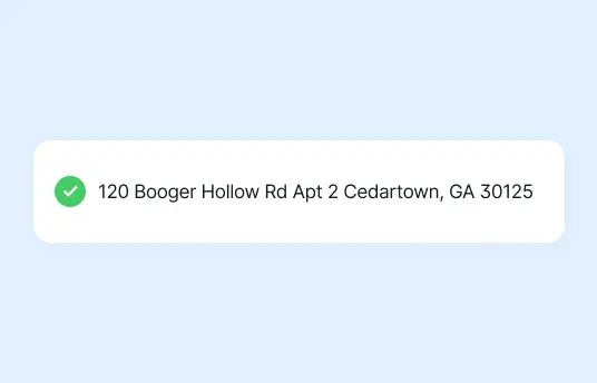| Only suggests valid, verified addressesAll suggested addresses are already verified as actual locations | |||||